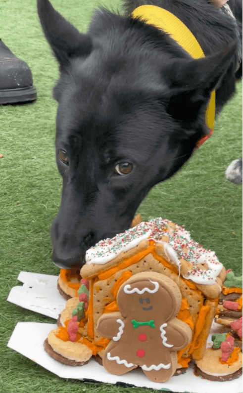 Las paredes con sabor a manzana y canela se unían con queso KONG de color naranja brillante. En los techos colocaron pequeños huesitos rojos y verdes, además de chispas decorativas seguras para perros.