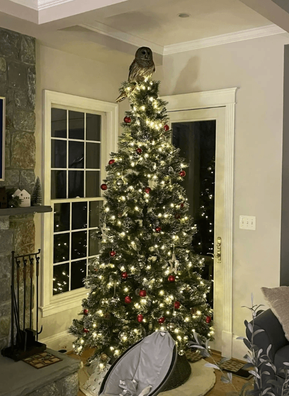 Iluminado por las luces del árbol, un búho barrado salvaje estaba tranquilamente posado en la punta, como si hubiera decidido convertirse en el Santa Claus más inesperado de la Navidad. Al parecer, el ave había bajado por la chimenea en busca de un lugar cálido y terminó encontrando el mejor asiento de la casa.